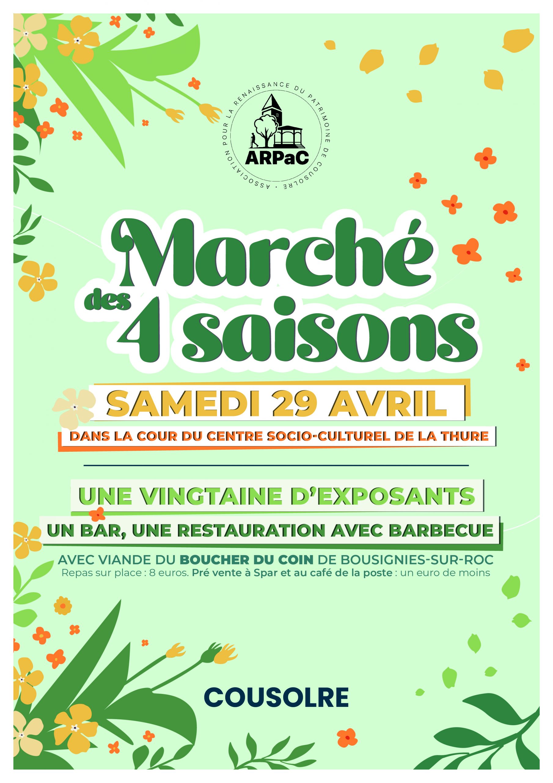 L'association pour la renaissance du patrimoine de Cousolre (ARPaC) organise un marché des 4 saisons avec des producteurs locaux le samedi 29 avril 2023.